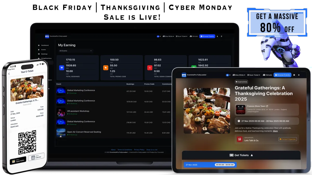 This Black Friday, Eventmie V3.0 gives you a complete self-hosted event and ticketing system 80% Off* discount. It’s an all-in-one event management and registration software built for selling tickets online, running concerts, managing theatre shows, and handling bookings with full control.